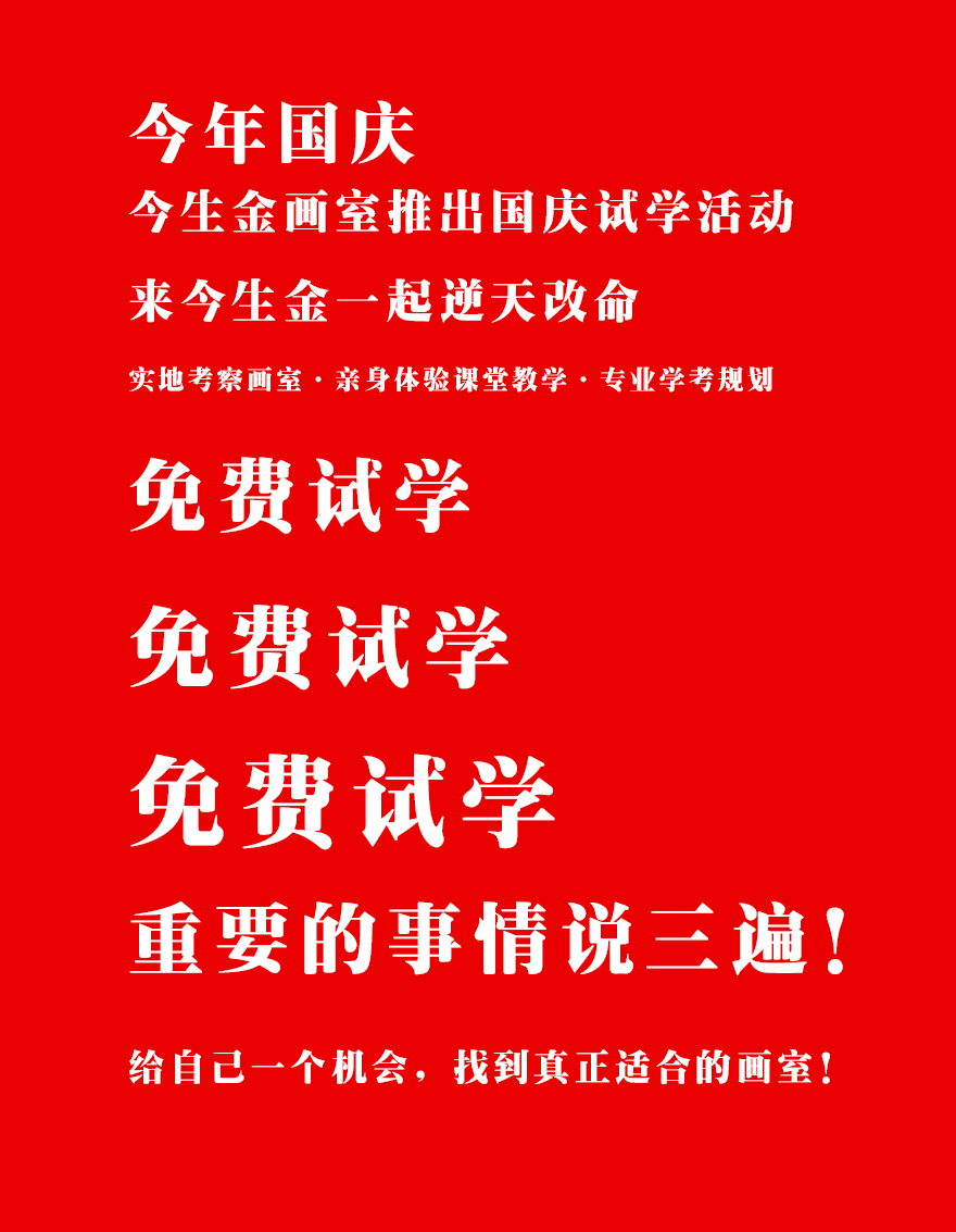今生金畫室具備一流的師資團(tuán)隊,針對國慶試學(xué)的同學(xué),也將用最優(yōu)的師資指導(dǎo)學(xué)生,讓學(xué)生感受最專業(yè)的教學(xué)。最高效率,提升專業(yè)能力。